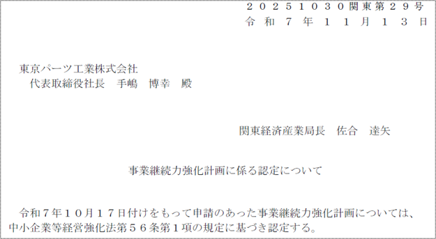 関東経済産業局長から「事業継続力強化計画」が認定されました。